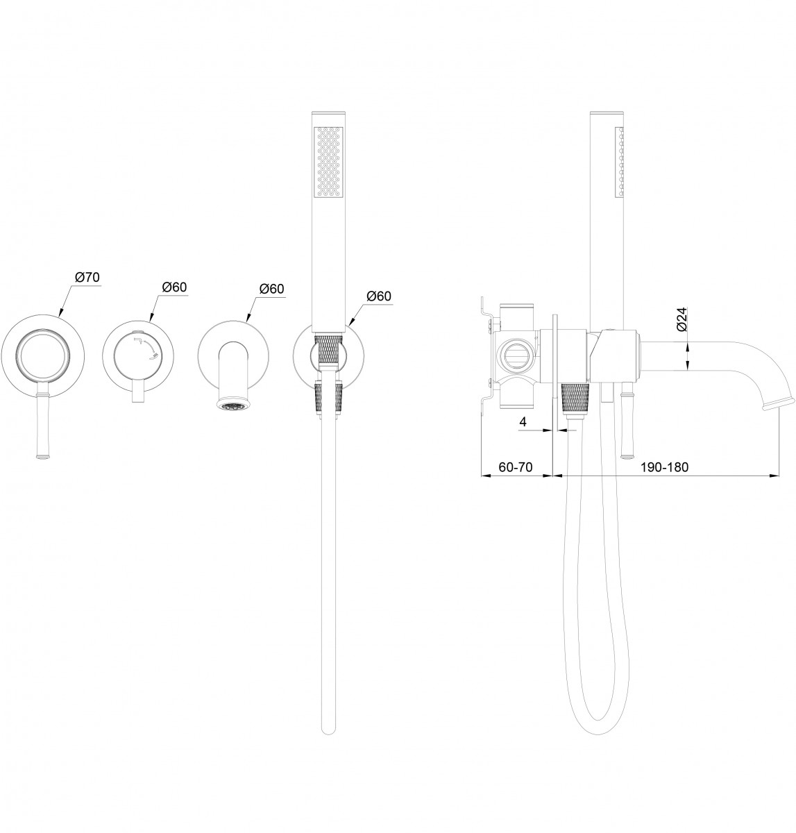 - Комплектация Смеситель / Душевой шланг/ Держатель для душа / Душевая лейка / Эксцентрики / Монтажный комплект