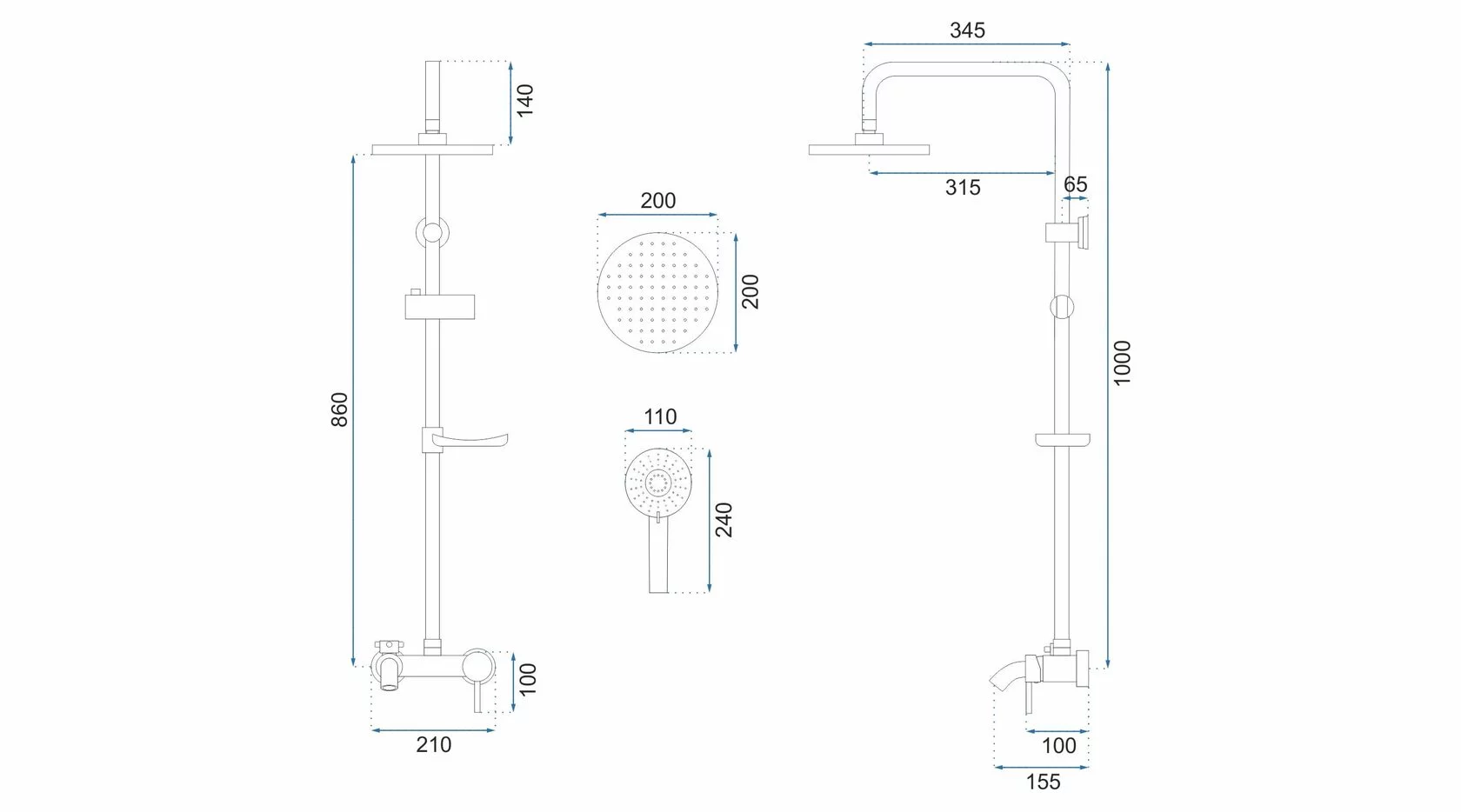 Оснащение: аэратор, металлическая розетка, эксцентрики, душевой шланг, душевая лейка, верхний душ, смеситель, кронштейн, мыльница, держатель для душевой лейки, штанга душевая.