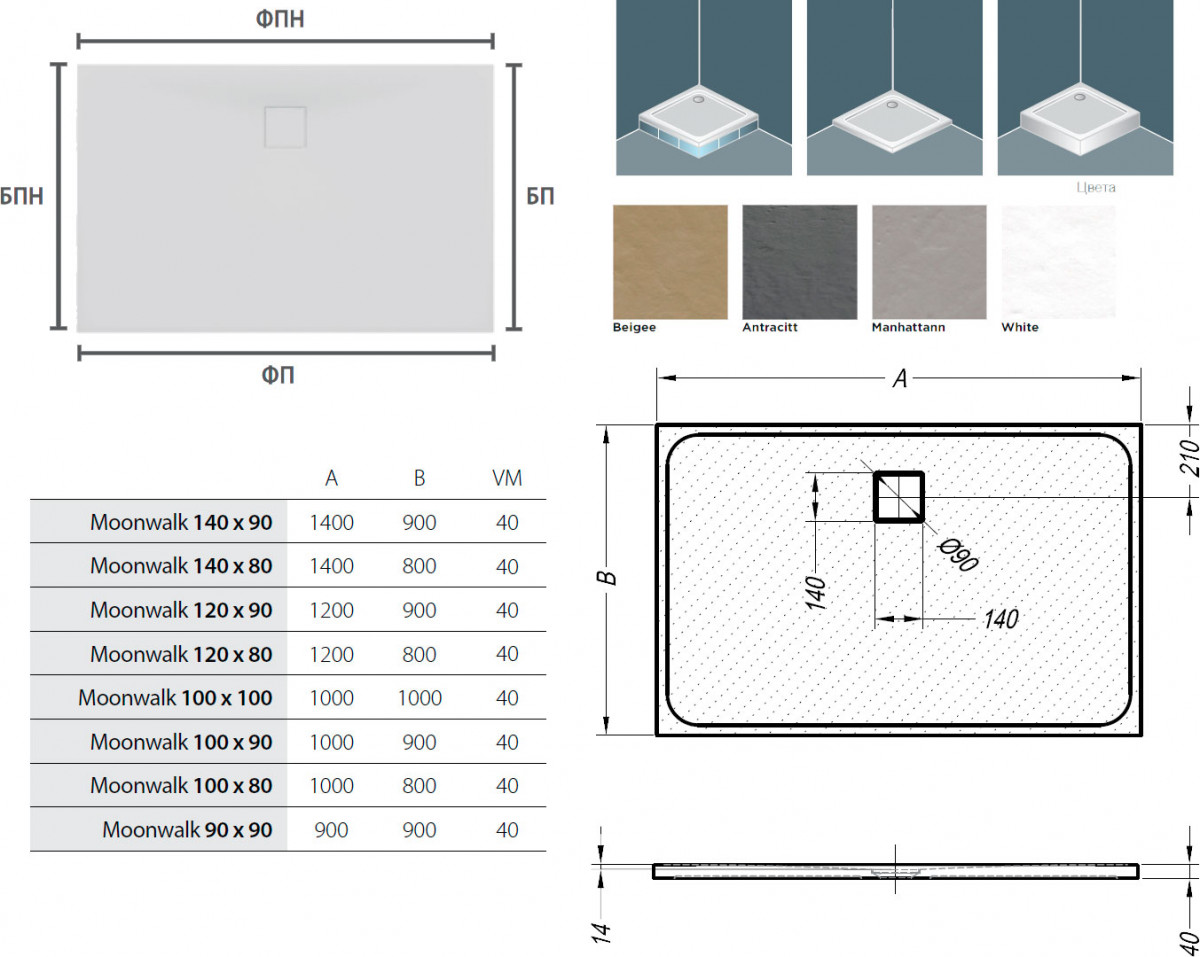 Душевые поддоны MOONWALK Kolpasan – изделия из текстурированного литьевого мрамора. В ассортименте модели прямоугольные или квадратные: минимальный размер 90х90, максимальный – 140х90. Габариты стоит выбирать под площадь ванной комнаты, чтобы душевая зона органично вписывалась в интерьер. Вместе с душевыми поддонами стоит заказать комплектацию, оптимальную с точки зрения монтажа.
