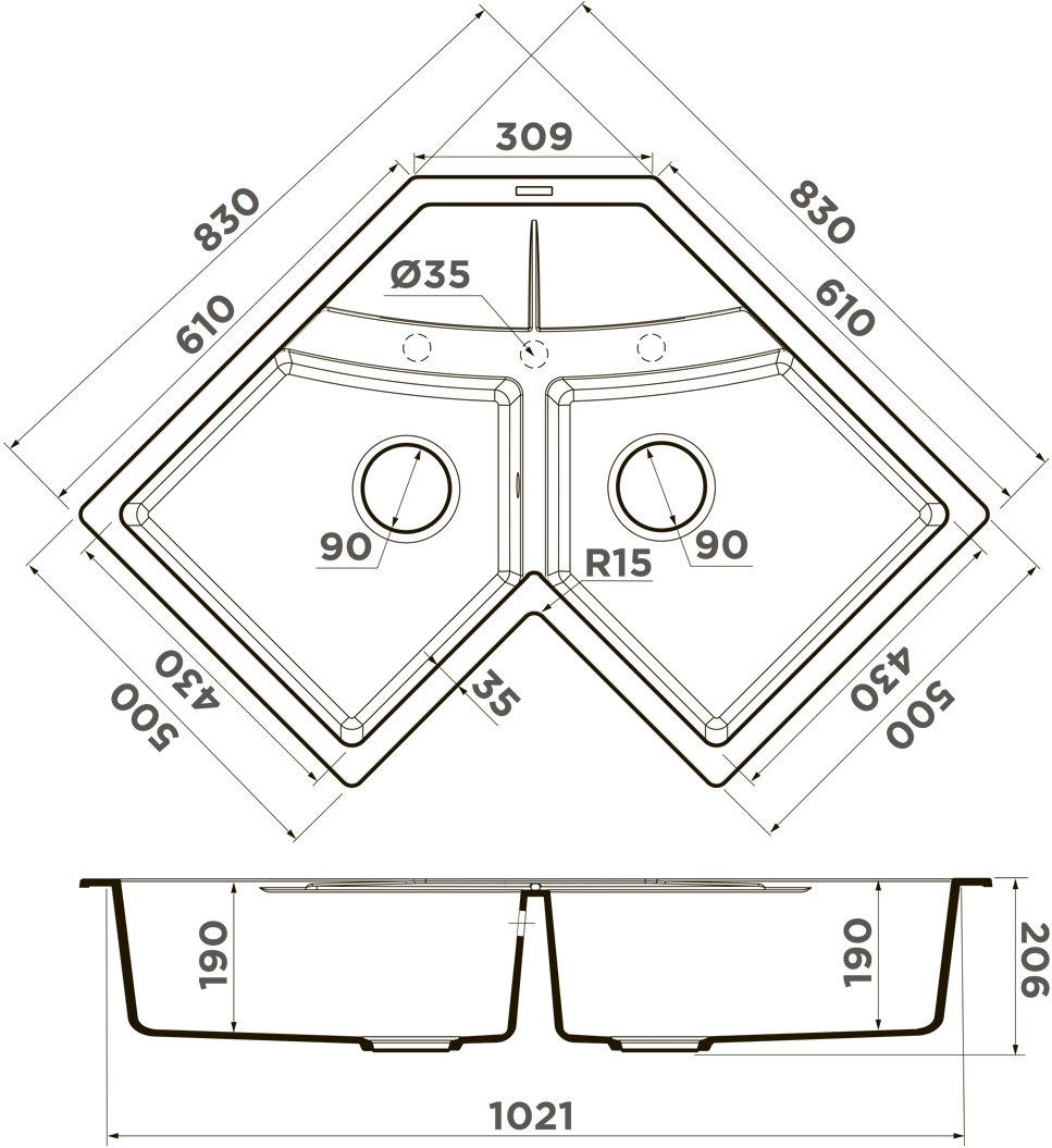 - Размер основной чаши (Ш х Д х Г), см 50 x 42.5 x 19