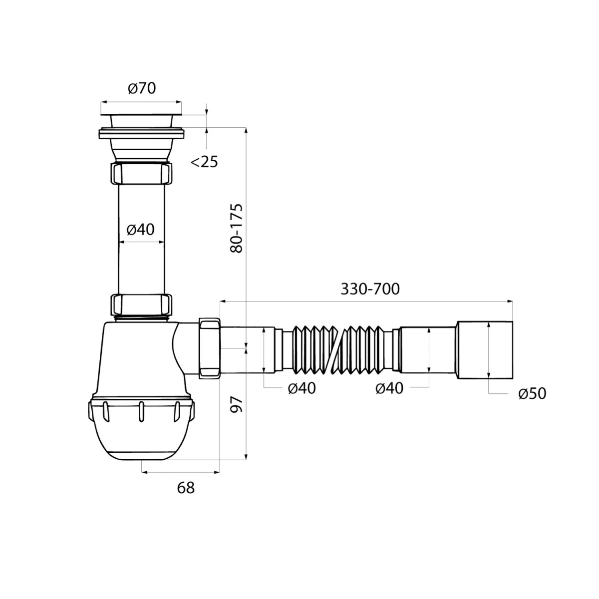 • Гофротруба длиной от 330 до 700 мм позволяет установить сифон без точной подгонки под канализационный вывод.