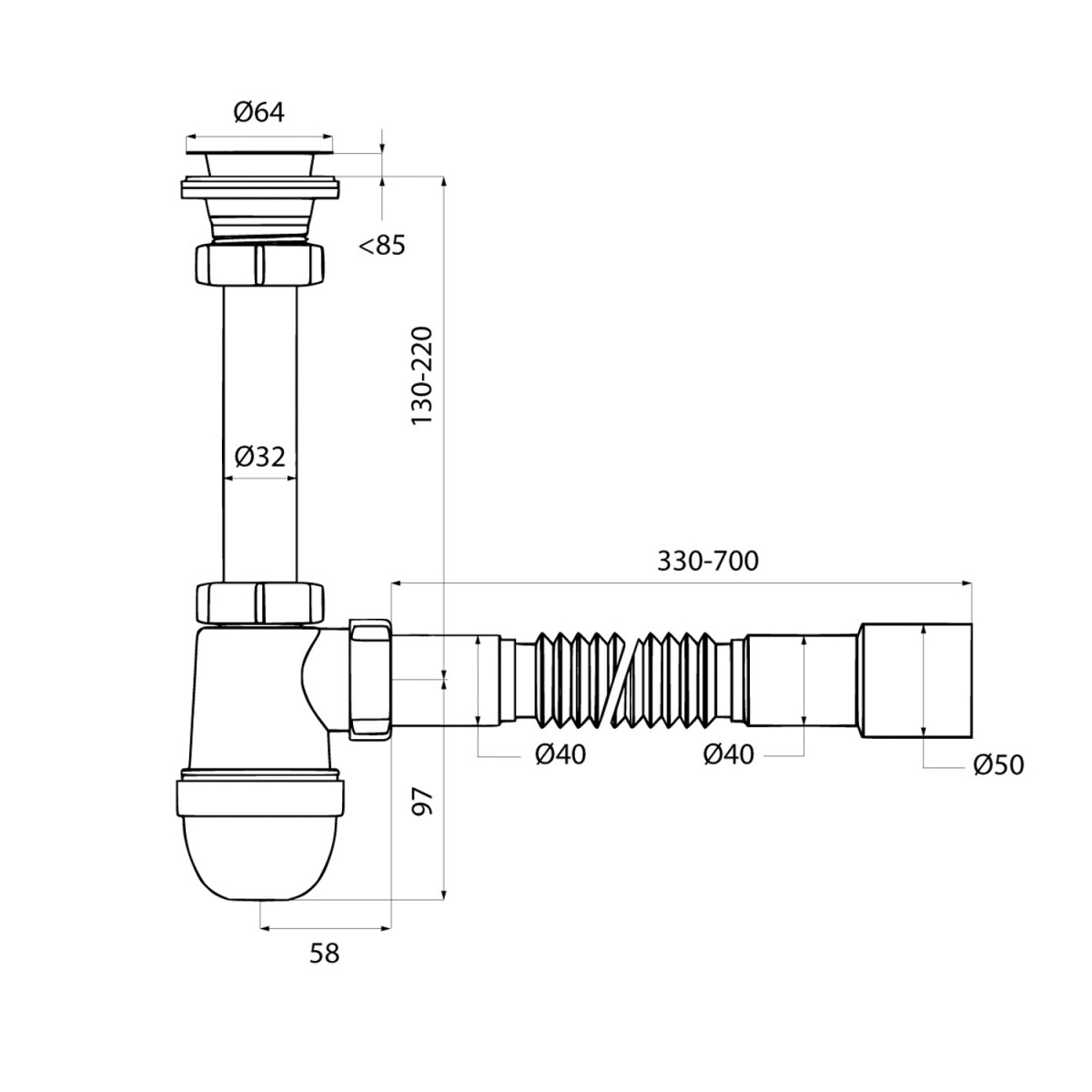 • Гофротруба длиной от 330 до 700 мм позволяет установить сифон без точной подгонки под канализационный вывод.