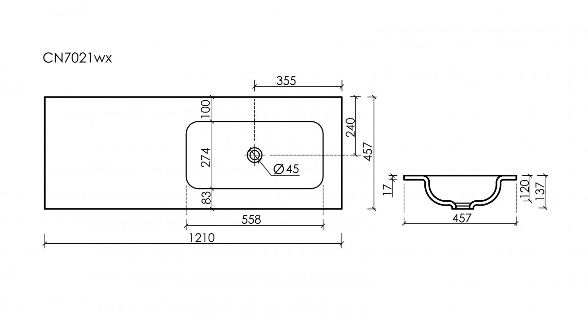Раковина накладная мебельная Ceramicanova Grace прямоугольная 1210x457x137 чаша справа без отверстия под смеситель белый CN7021wx