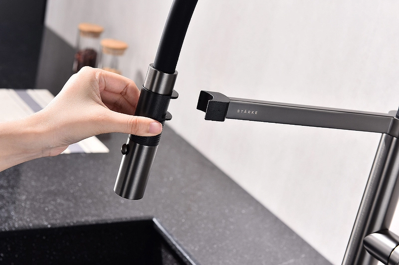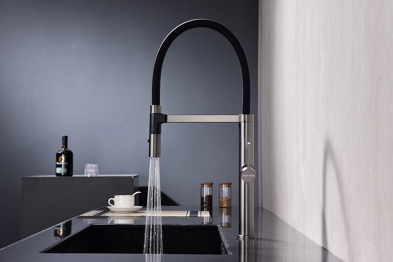 Смеситель для кухни Paulmark Leader Le214101-GM. Цвет-вороненая сталь. Излив: гибкий, поворотный. Функции: струя, душ. Комплектация: смеситель, гибкая подводка 40 см, усиленный комплект крепления
