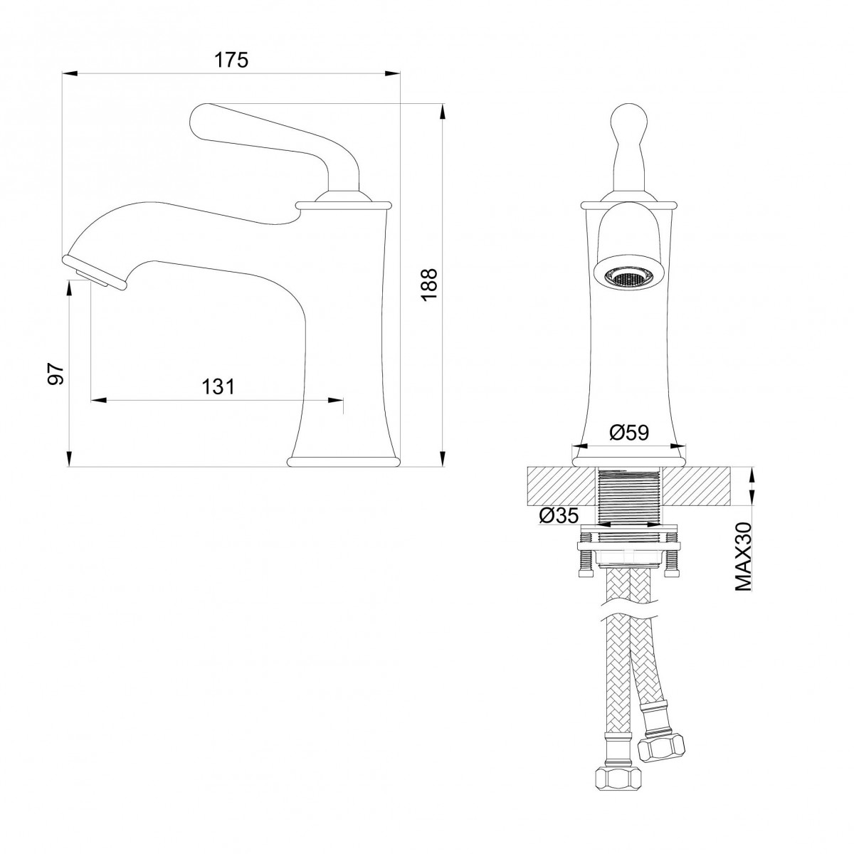 - Комплектация Смеситель / Гибкая подводка / Монтажный комплект