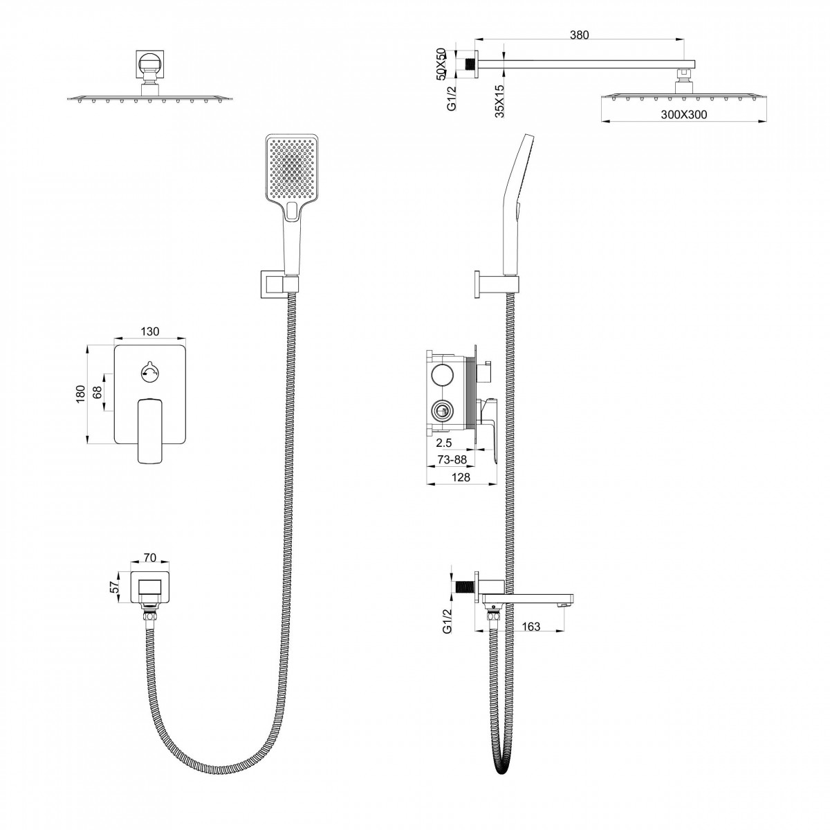 - Комплектация Смеситель / Душевой шланг/ Держатель для душа / Верхний душ / Душевая лейка / Монтажный комплект