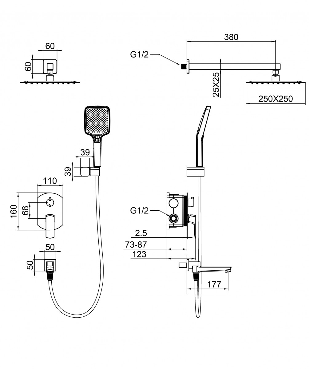 - Комплектация Смеситель / Душевой шланг/ Держатель для душа / Верхний душ / Душевая лейка / Монтажный комплект